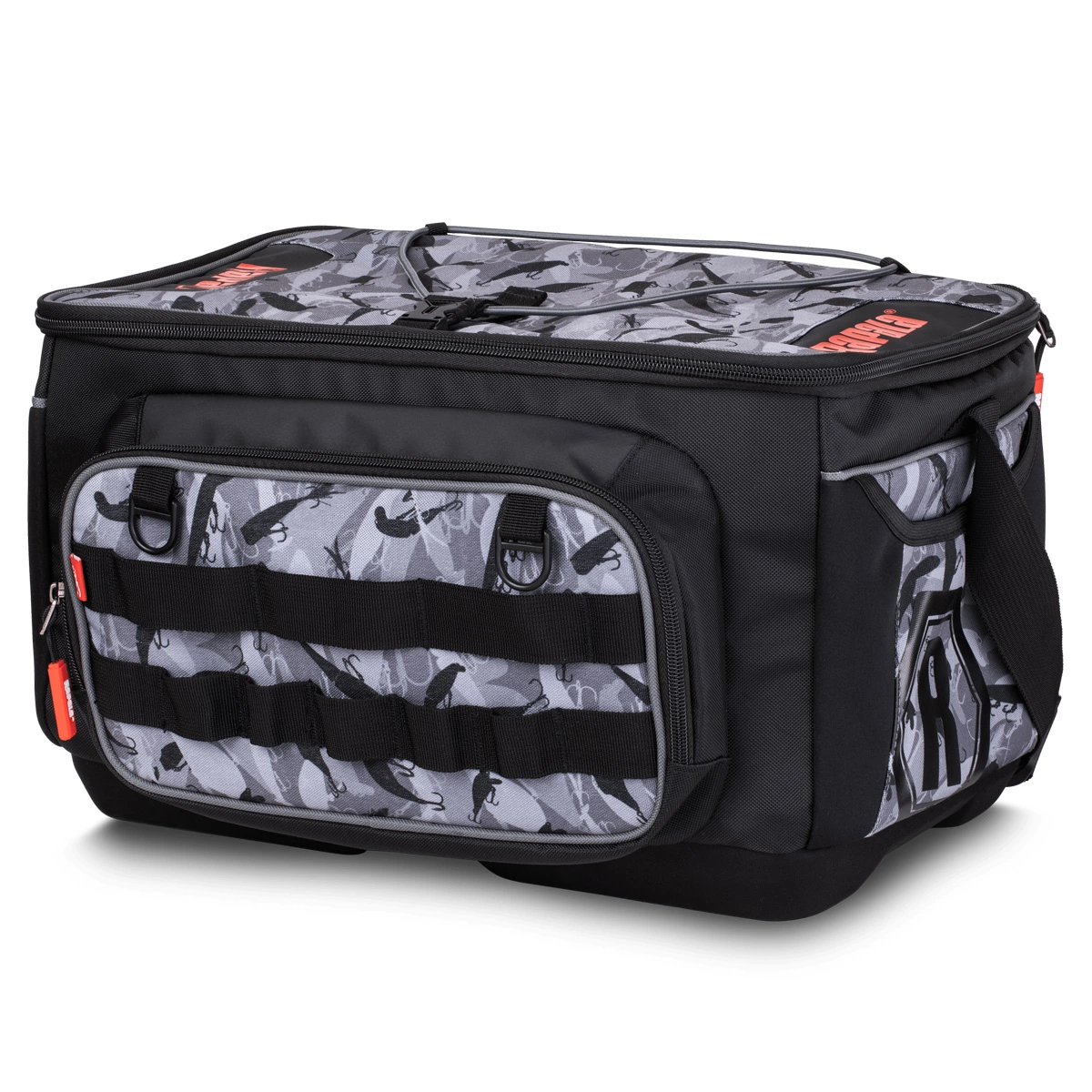 Rapala LureCamo Tackle Bag’s front pocket features an eternal daisy chain for easy access tool storage and multiple organizer pockets. Zippered see-through pocket inside the lid. Neoprene panels on side pockets for extra capacity. Padded, adjustable shoulder strap. YKK zippers. Tackle boxes not included.