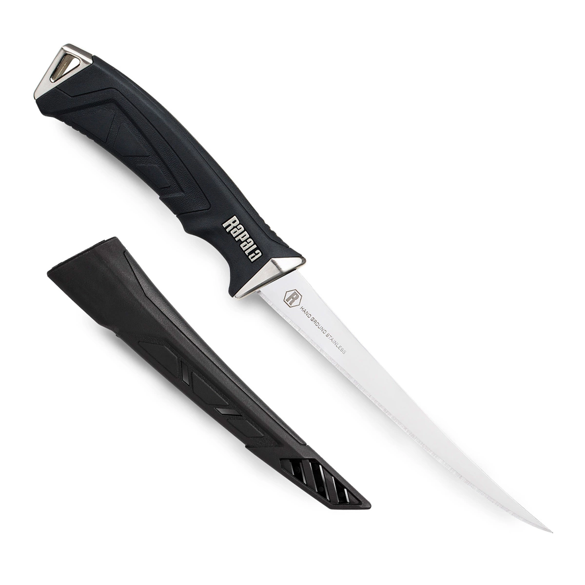 Built with a flexible, high polished full tang blade made of Japanese stainless steel, the RCD Fillet Knife features a hande ground progessive taper that’s ideal for filleting and removing rib bones from the fillets. Ergonomic, no slip Soft Grip handle has a safety finger guard for a secure and safe grip. Technical, high compression sheath holds the knife securely.